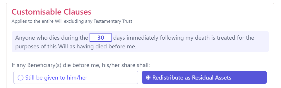 In the “Select Clauses” page, leave the survivorship period as 30 days and select “Redistribute as Residual Assets”.
