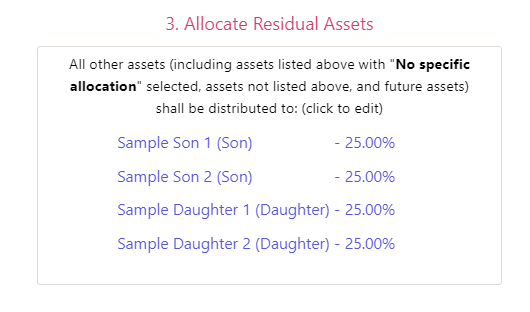 In the “Allocate Assets” page, you can leave all assets as “No specific allocation”, in which case they will be distributed based on the “Allocate Residual Assets” section.
