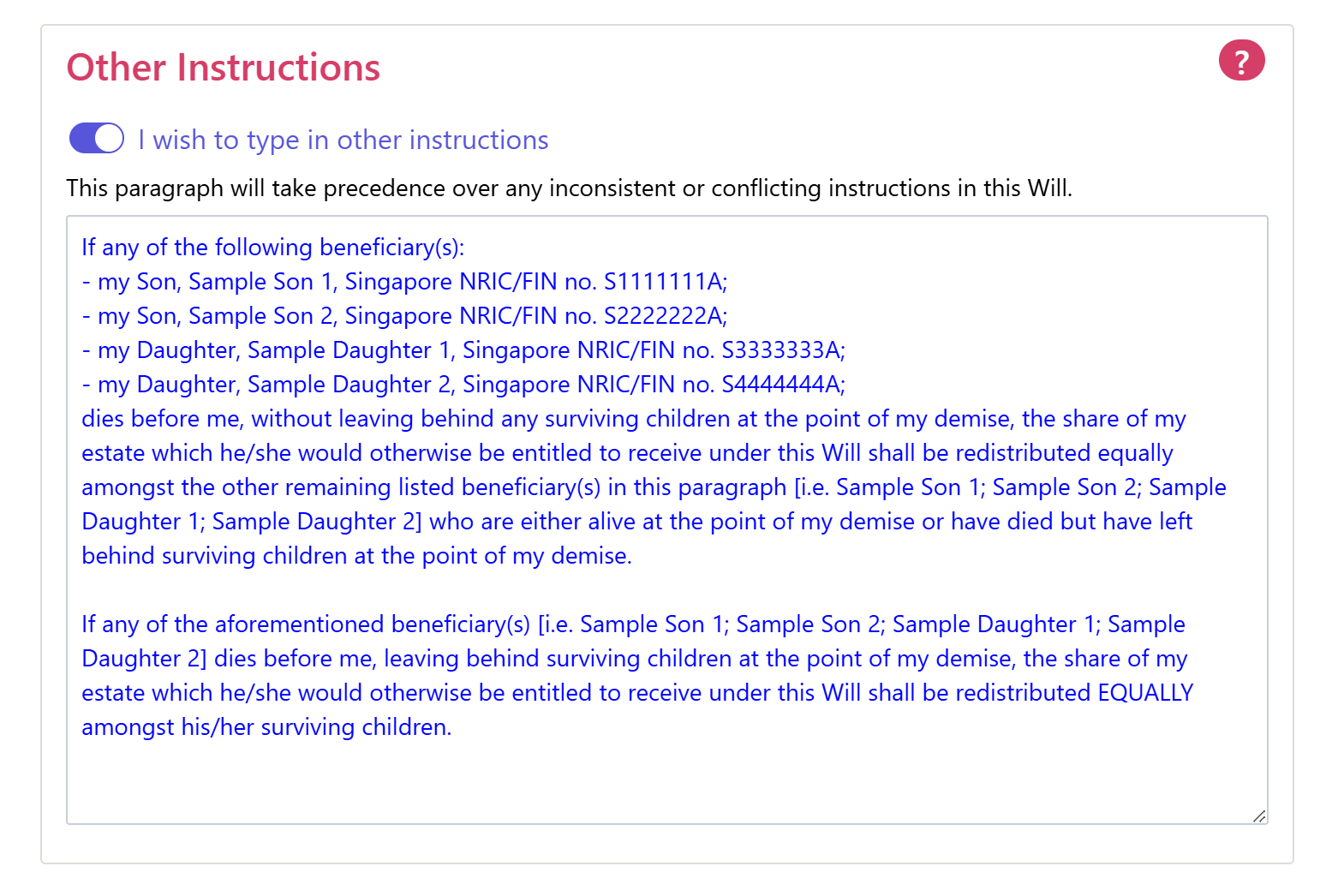Under the “Other Instructions” section, key either of the following substitute beneficiary clauses (please edit the details accordingly) depending on whether there are more than one child to redistribute to:
