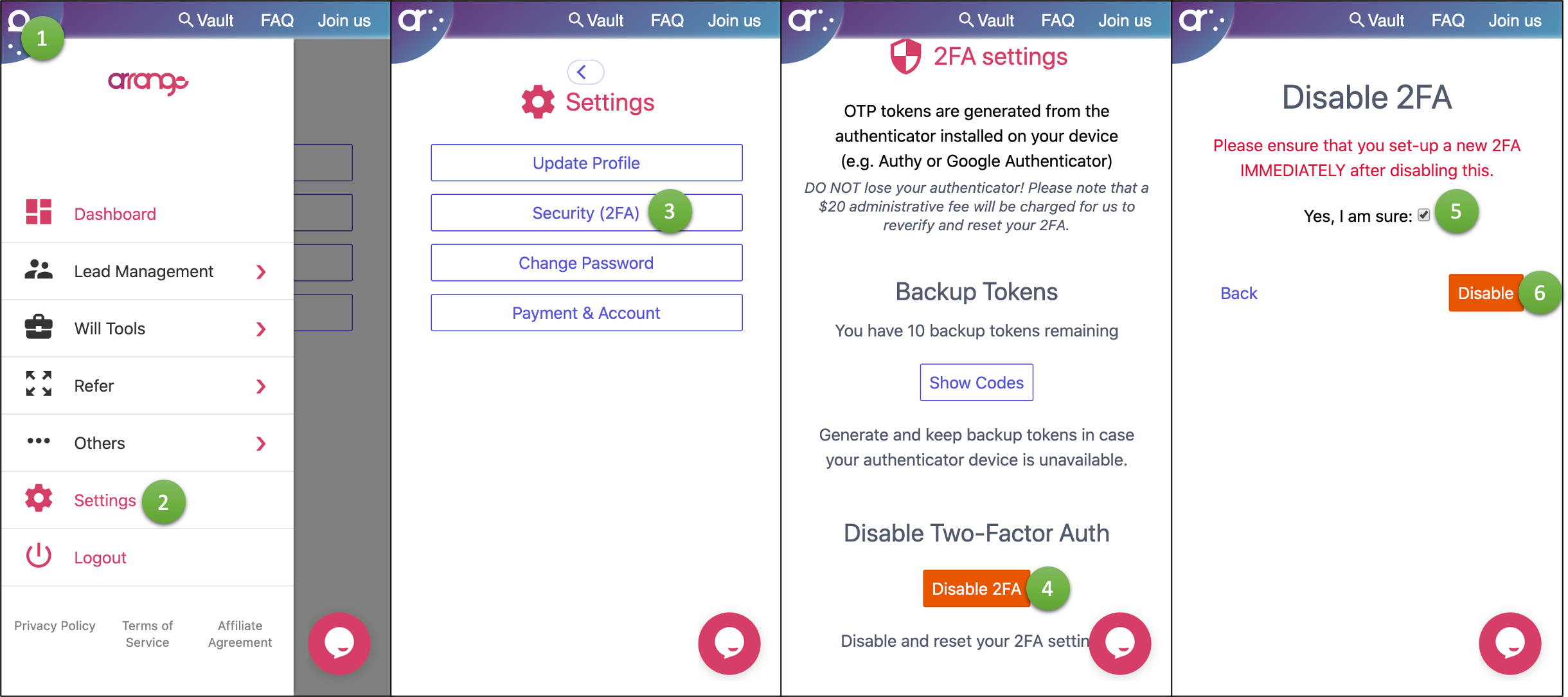 To disable the 2FA, go to Settings > Security (2FA) and click on "Disable 2FA" to reset your current 2FA settings.