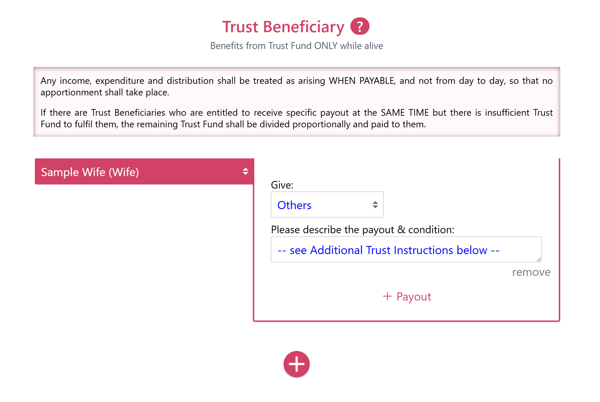 Under the Trust Beneficiary section, add the spouse and you can select the payout as "Others" and key in:
