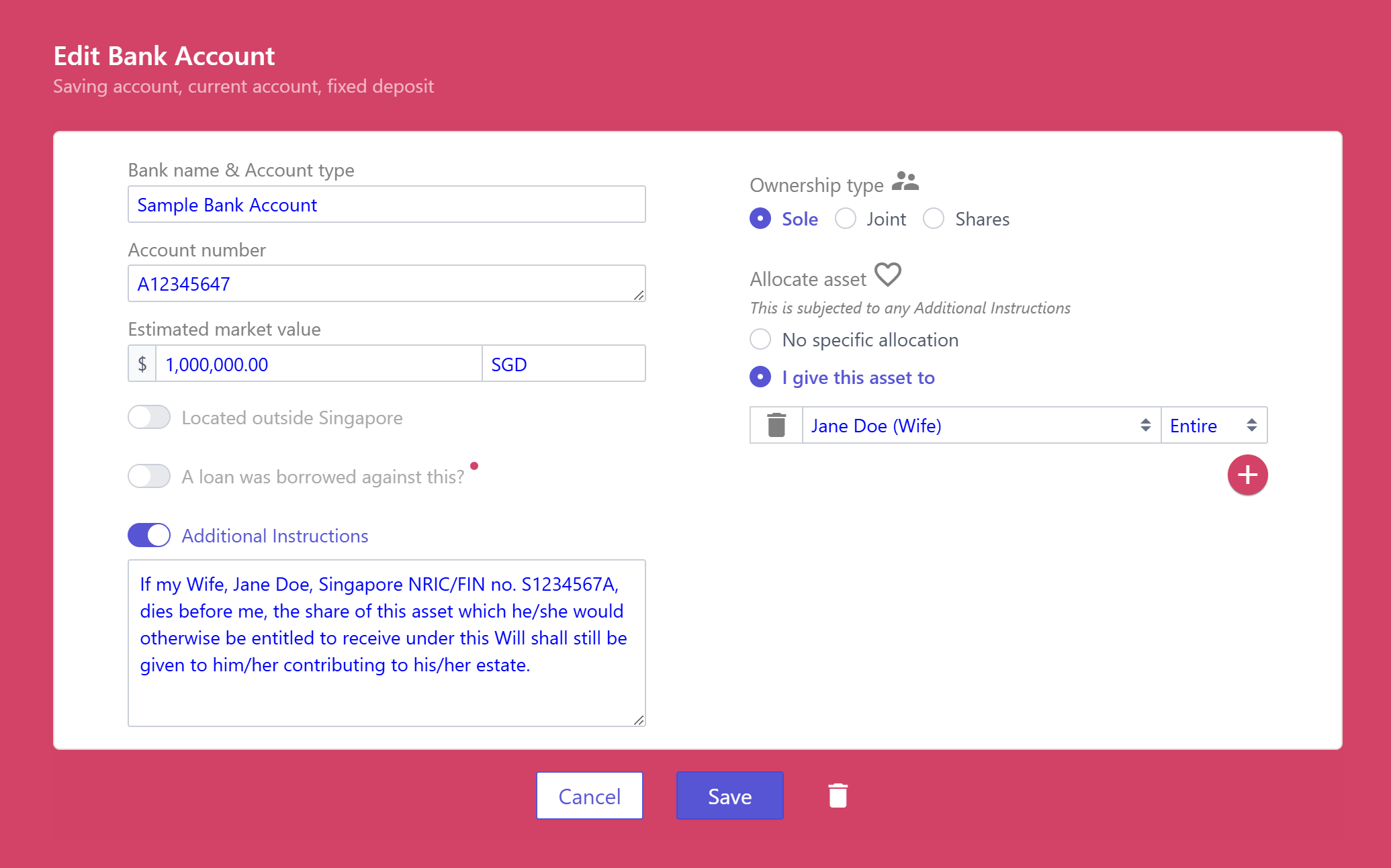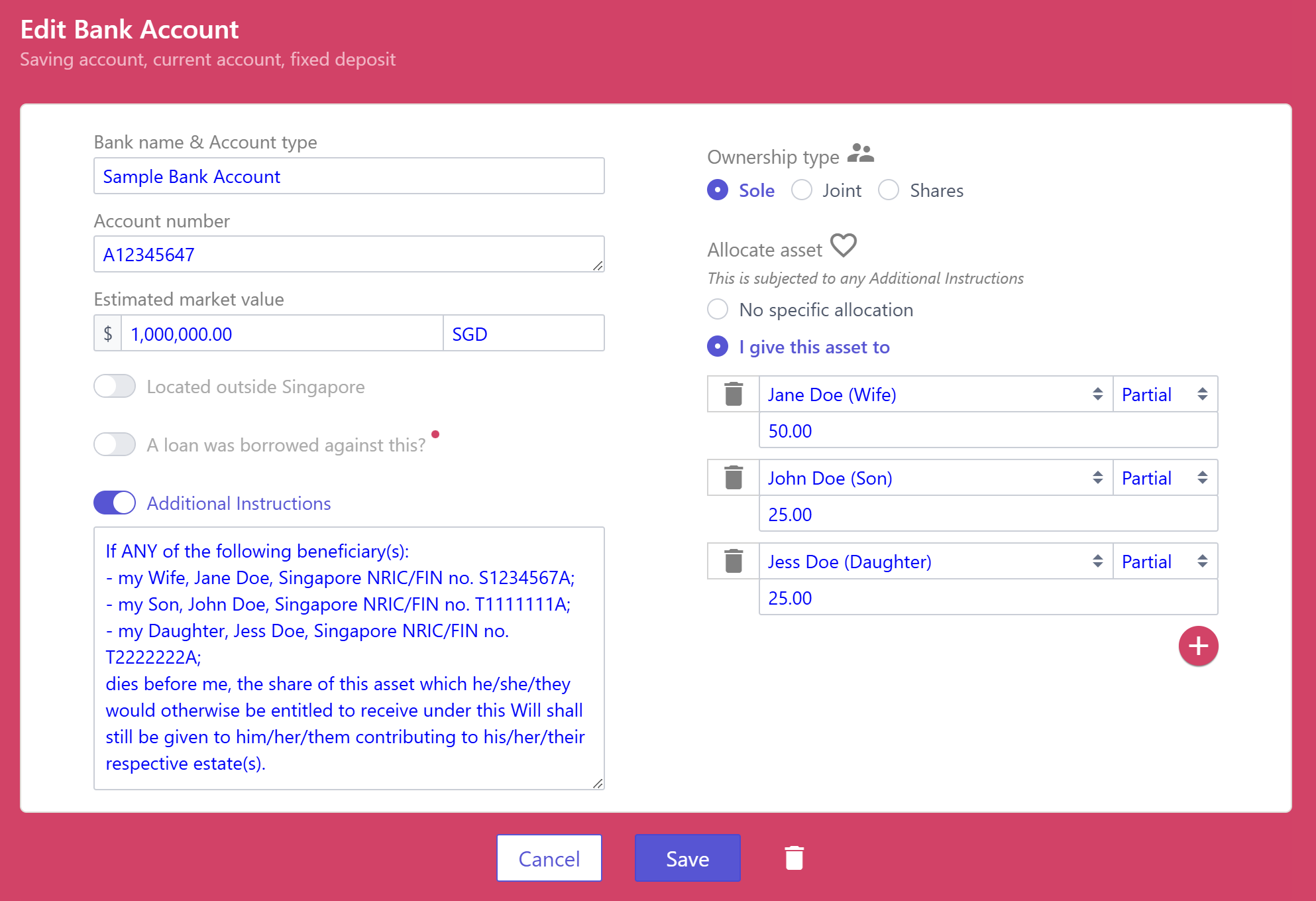 Under the Allocate Assets tab, select an asset, and allocate the asset (either entire or partial) to your beneficiary(s) according. Under " Additional Instructions" in the asset, key in the condition: