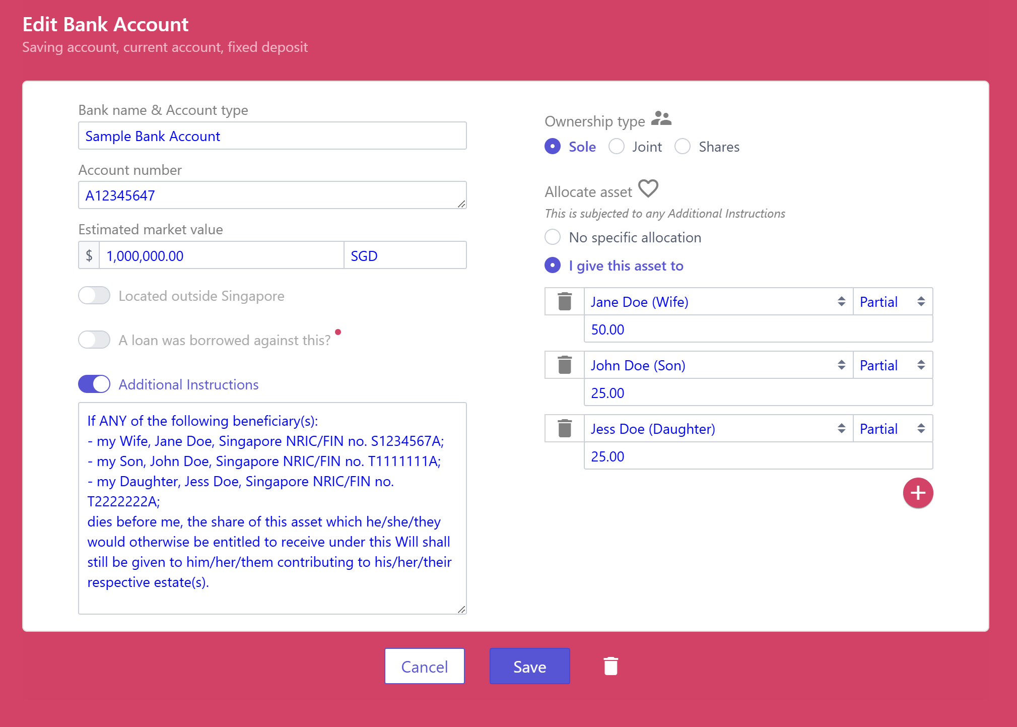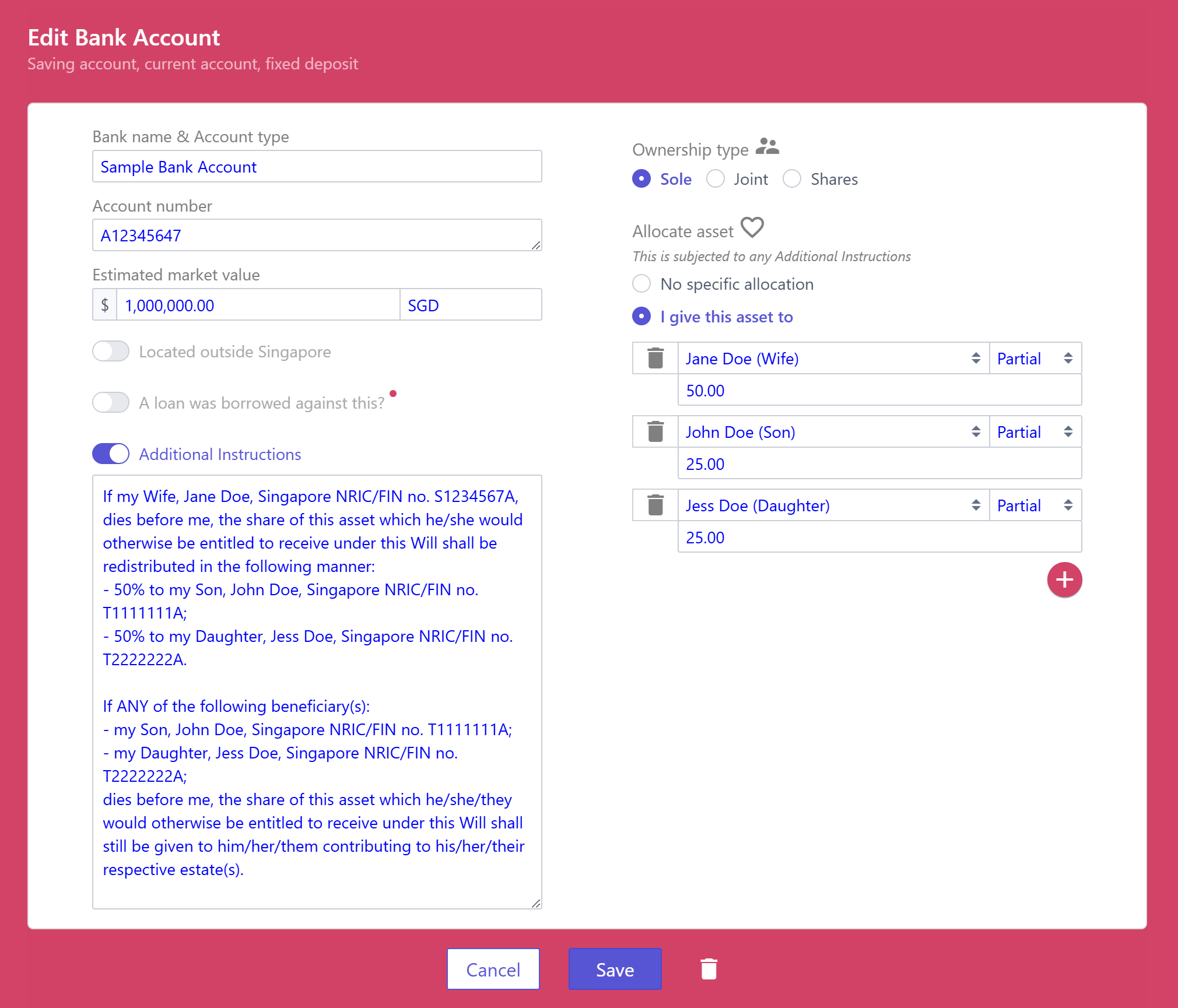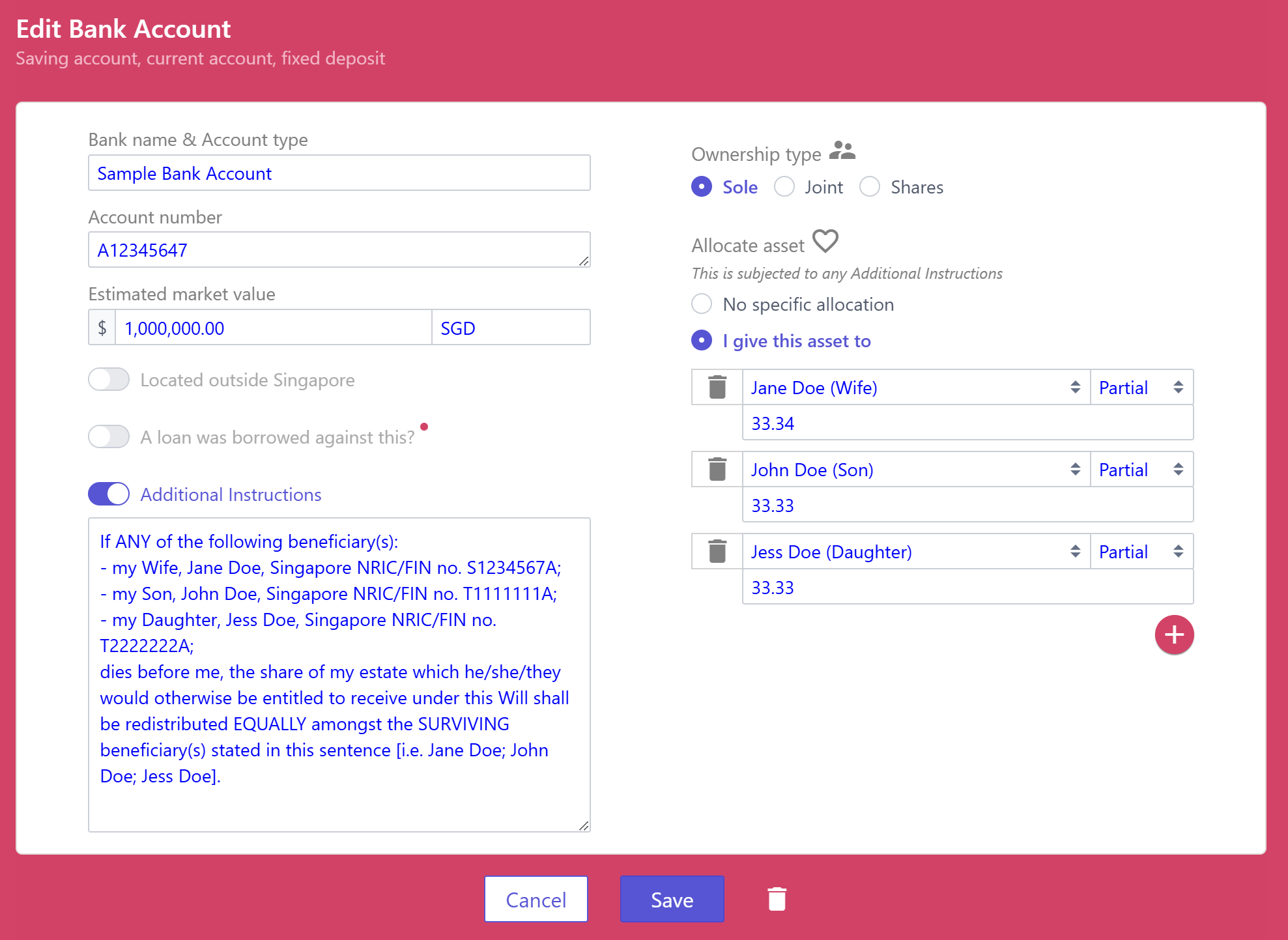 For the remaining assets, under "Select Clauses >> Other Instructions", input one of the modified (general) instructions, depending on whether the instruction is meant to apply to a single or multiple beneficiaries.