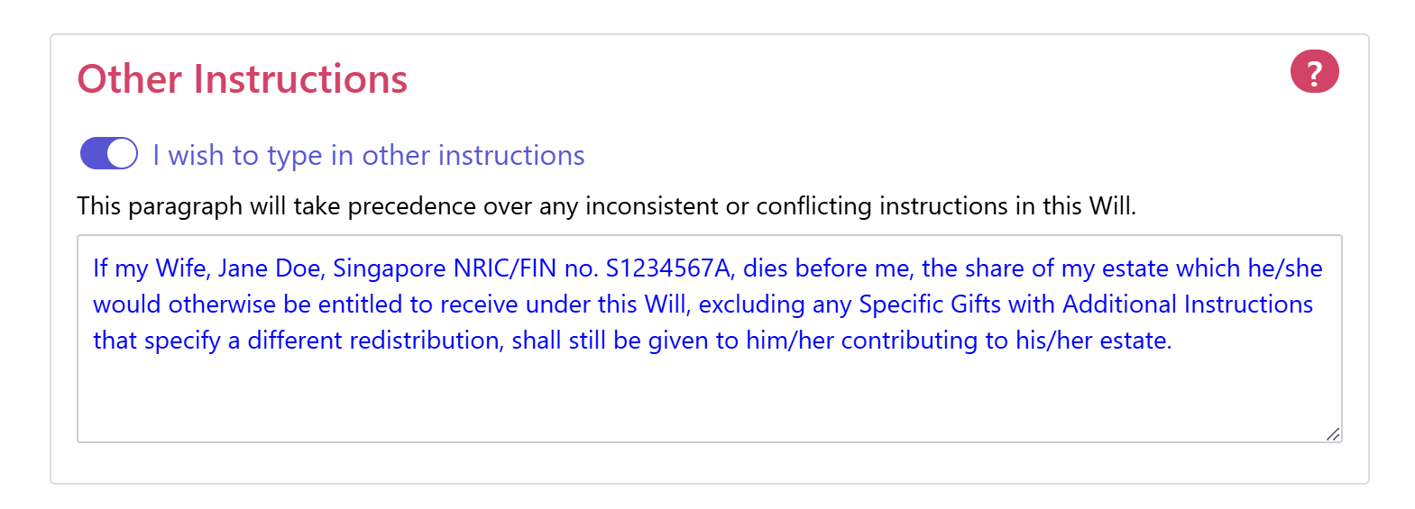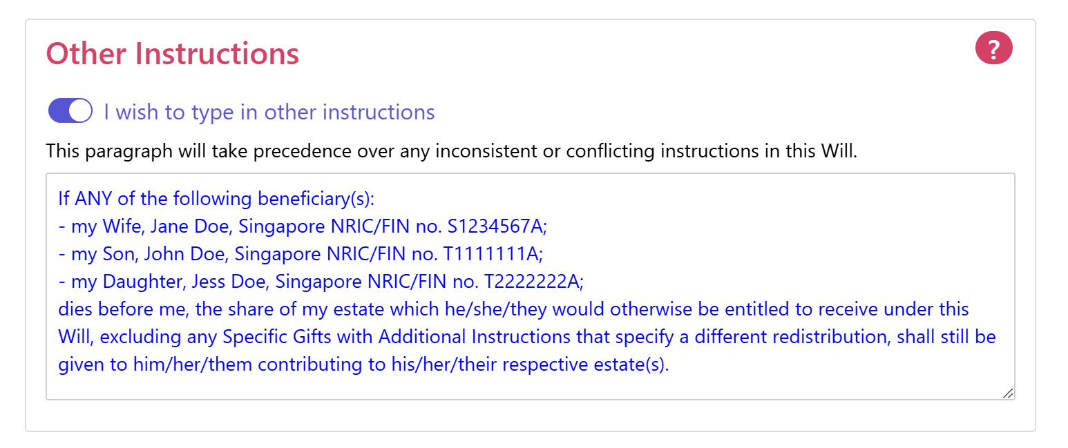 Say you intend for part of your estate, where some specific gifts have substitute beneficiaries (e.g. property to wife and son, and if son dies before you, redistribute to wife), or to have some specific gifts to still be given to any deceased beneficiaries contributing to his/her/their estate (e.g., bank account to the three daughters to be given to them regardless). For all other assets without such specification, you would like to specify the deceased beneficiary’s share of the entire estate to still be given to him contributing to his estate.