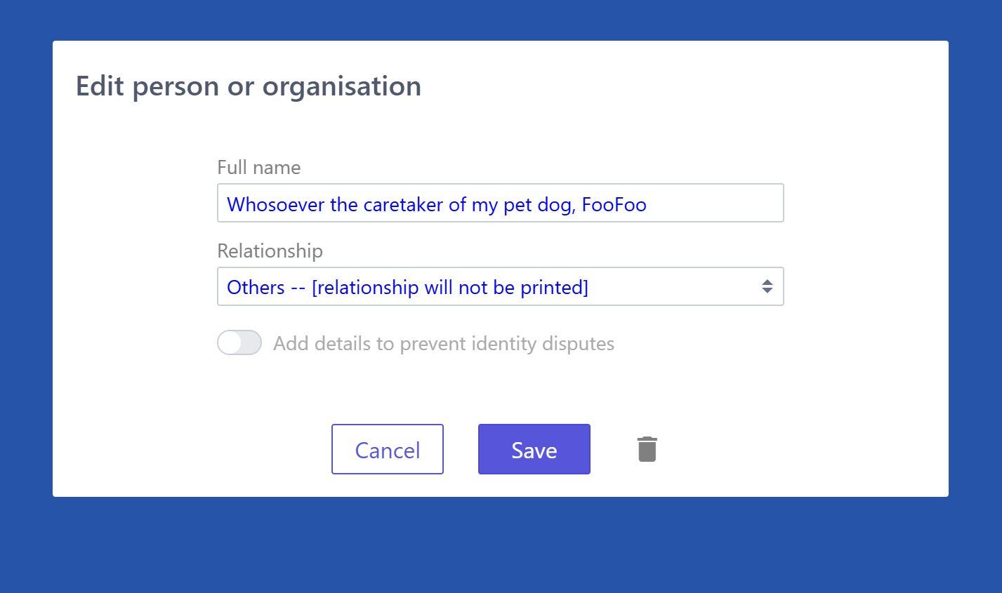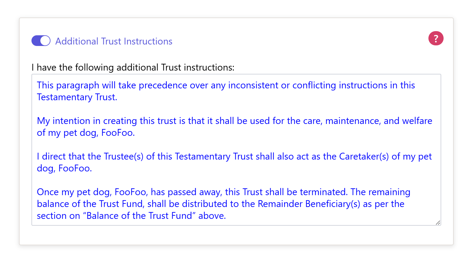 It is not necessary to create a separate testamentary trust solely for the purpose of providing for your pet. The payout may instead form part of a larger testamentary trust that also provides for other family members or friends. However, where the testamentary trust is established solely for the purpose of providing for your pet, this intention should be expressly stated under the Additional Trust Instructions.