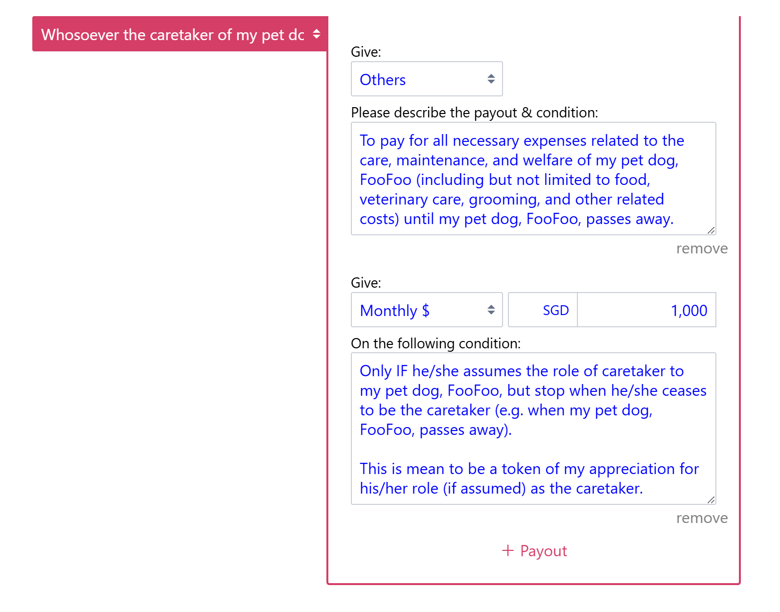 Under the Trust Beneficiary section, add the caretaker as a Trust Beneficiary with the following payout conditions: