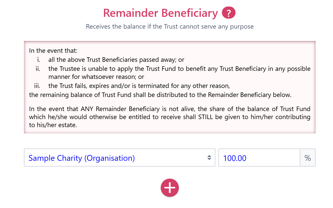 In the Appoint People page, add a testamentary trust and configure the name of the testamentary trust, the Trustee(s), and the Trustee Powers accordingly. You will also need to allocate assets into the testamentary trust.