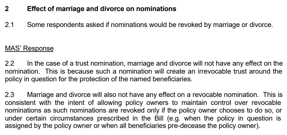 However for insurance nomination, both marriage and divorce does not have any effect on a trust or revocable insurance nomination.