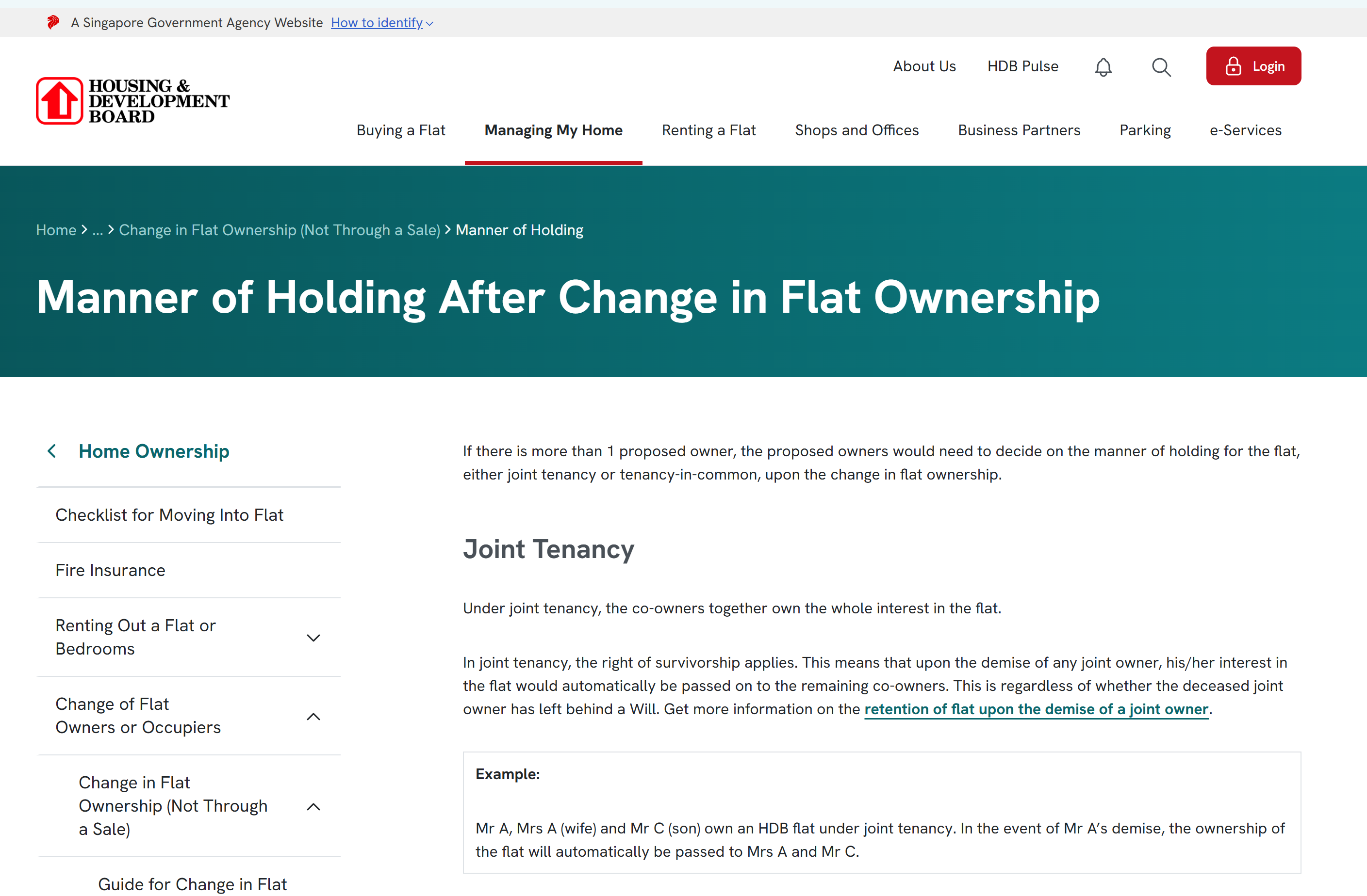 For example, for HDB flats, a joint-tenancy is a form of property ownership where all co-owners have an equal interest in the property, regardless of the individual owner's contribution to the property purchase. This means that upon the death of a joint-tenant, his interest in the property will automatically pass on to the remaining co-owner(s), regardless of whether he has made a will. (Source: Manner of Holding After Change in Flat Ownership, HDB website)